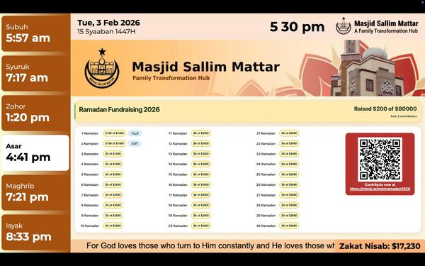 With this system, donations made through the online link or QR code are reflected instantly on the mosque’s screens, allowing the community to see live progress together. The displays also show real-time prayer schedules and countdowns to iqamah. Instead of static